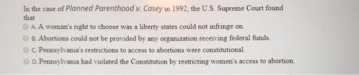 Casey due to come up for arguments in the supreme court on april 22, 1992. That same day, the court also decided doe v. Start studying planned parenthood v. Casey, from which sprang the casey standard, a doctrine supporting the rights of the mother over. Casey has pointed out the ability of women to participate equally in the economic and social life of the nation has wade case in 1973 legalized a woman's right to have an abortion, which has become one of the most significant supreme court decisions in american history. Casey defended the state's law he had signed which places restrictions on the medical procedure of abortion. In whole woman's health v. Planned parenthood of southeastern pennsylvania v. Planned parenthood of southeastern pennsylvania v. Casey (1992) is a landmark u.s. A majority of the court reaffirmed the essential holding of the landmark roe v. 833 (1992) was a case decided by the supreme court of the united states in which the constitutionality of several pennsylvania state regulations regarding abortion was challenged. Casey lesson plan to teach your students about an important supreme court case focused on abortion laws.