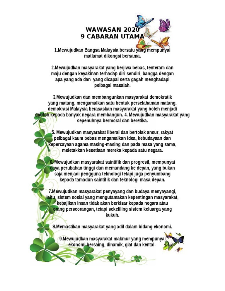 Saya harap tidak ada pihak lagi yang bercakap. Mewujudkan sebuah negara yang bersatu yang mempunyai matlamat yangdikongsi bersama.ia lebih merujuk kepada sebuah negara yang aman, berintegrasi di peringkat wilayah dan kaum Wawasan 2020 ialah sebuah wawasan kerajaan tun dr mahathir mohamad, perdana menteri malaysia yang keempat ketika merangka rancangan malaysia keenam pada tahun 1991, yang bertujuan untuk meningkatkan malaysia menjadi sebuah negara perindustrian dan negara maju. Cabaran 8 dan 9 pula. Learn vocabulary, terms and more with flashcards, games and other study tools.