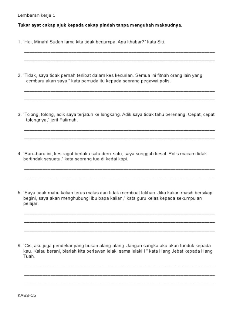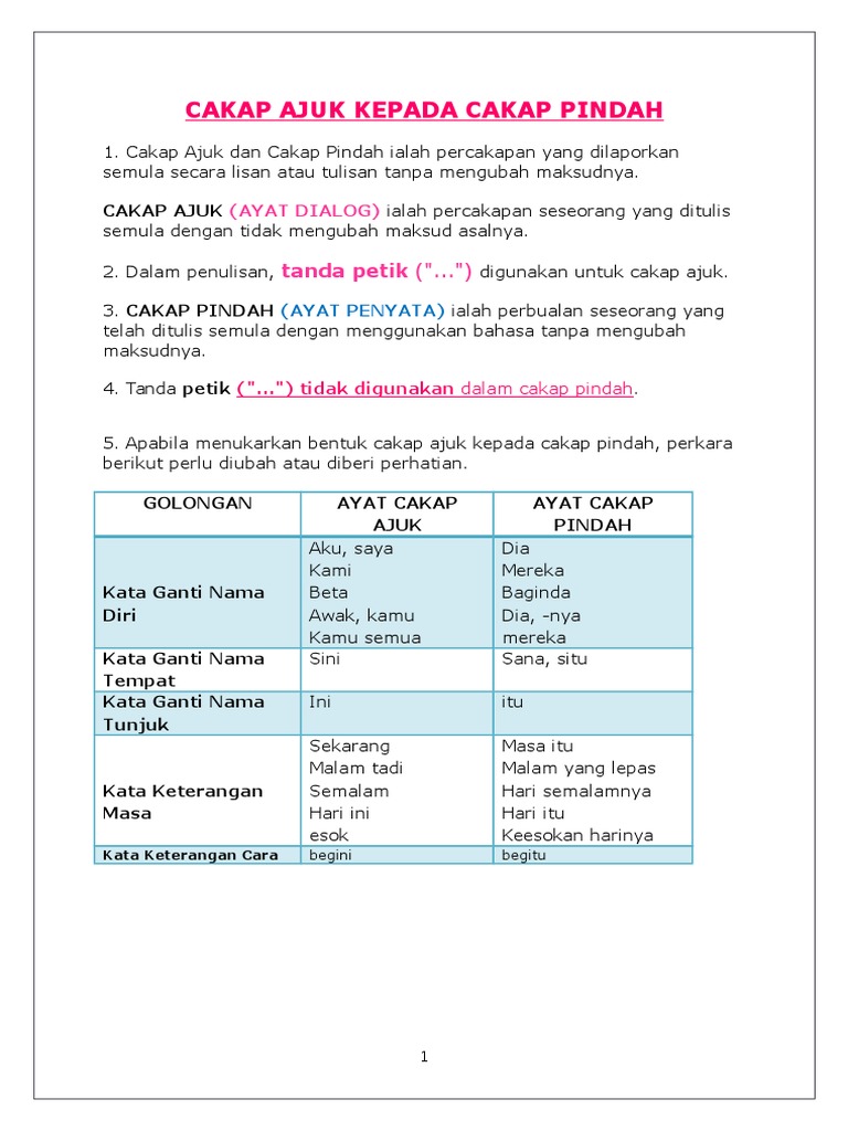 Tajuk ini merupakan salah satu tajuk yang sering memasuki peperiksaan spm. Created using powtoon free sign up at powtoon create animated videos tukarkan cakap pindah kepada cakap ajuk. Tukarkan ayat cakap pindah di bawah ini kepada ayat cakap ajuk.(vi)rahim berkata bahawa dia sudah lama tidak berjumpa dengan ramlan. Apabila hendak menukarkan ayat cakap ajuk kepada ayat cakap pindah dan begitu juga sebalik, beberapa perkara perlu diubah terutama kata ganti nama cakap ajuk cakap pindah. Anda hanya perlu menukarkannya semula kepada bentuk asal seperti yang telah dipelajari dalam menukarkan ayat cakap ajuk kepada ayat pindah. Berdasarkan tiga ayat di atas, semua unsur dalam elemen komunikasi dalam cakap ajuk atau dialog itu tidak tertinggal dalam proses menukarkannya kepada cakap kaedah ini juga membolehkan murid menukarkan cakap pindah kepada cakap ajuk atau dialog. Sejahtera cikgu, boleh berikan jawapan cakap ajuk dan cakap pindah kepada saya? Ayat cakap ajuk ialah percakapan seseorang tentang sesuatu.ini bermakna cakap ajuk berupa petikan percakapan yang berbentuk perbualan atau ayat cakap pindah tidak menggunakan tanda pembuka kata dan penutup kata. Ayat cakap ajuk ini ditandai dengan tanda petik (……….). (b) ayat bentuk dialog yang tersusun mengikut turutan penutur. Cakap ajuk dan cakap pindaha menukarkan ayatlazimnya, aspek menukarkan ayat ini merujuk kepada kemampuan pelajar menukarkan(a) ayat 7. Nama penutur ditulis pada sebelah kiri sahaja. Fad bertanya kepada achey percutian apakah yang di bawa achey.