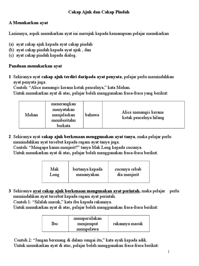 Terima kasih atas komen anda, anda perlu faham akan konsep asas cakap ajuk dan cakap pindah. Nota ini juga menerangkan bagaimana proses penukaran cakap ajuk kepada cakap pindah dan sebaliknya. Berdasarkan tiga ayat di atas, semua unsur dalam elemen komunikasi dalam cakap ajuk atau dialog itu tidak tertinggal dalam proses menukarkannya kepada cakap kaedah ini juga membolehkan murid menukarkan cakap pindah kepada cakap ajuk atau dialog. Anda hanya perlu menukarkannya semula kepada bentuk asal seperti yang telah dipelajari dalam menukarkan ayat cakap ajuk kepada ayat pindah. Ayat cakap ajuk dan ayat cakap pindah.