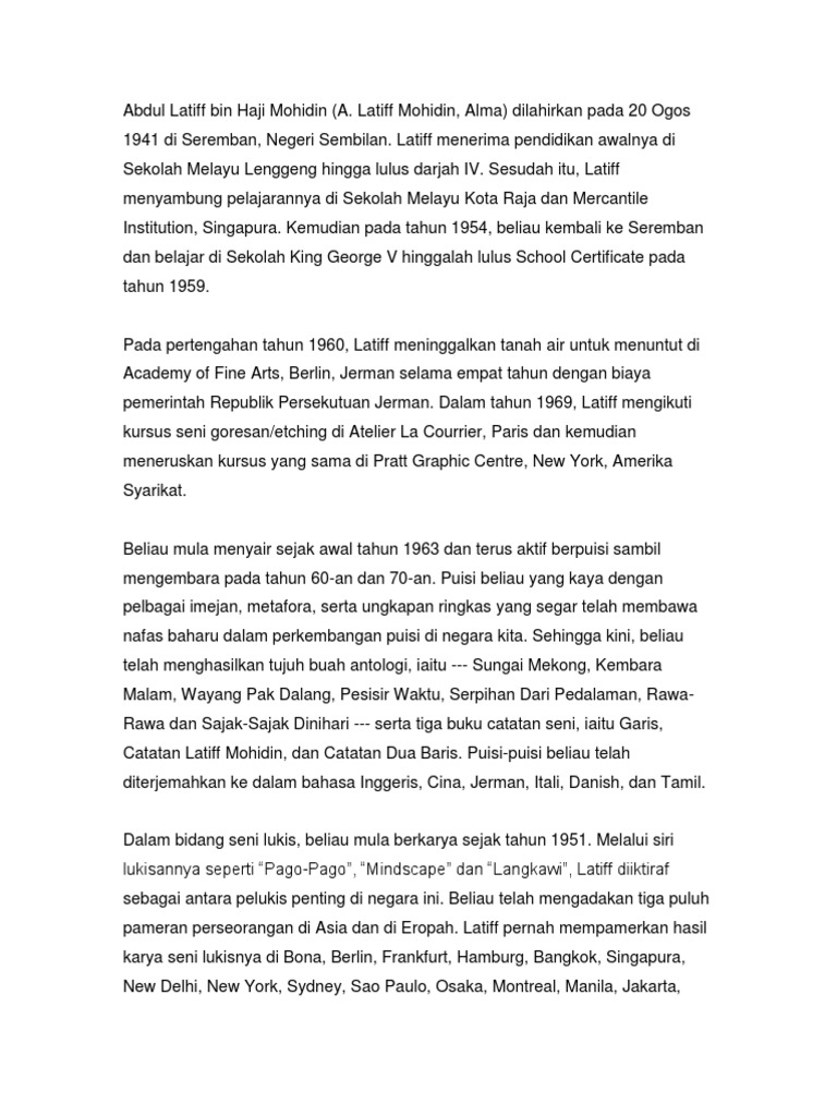 Related : Biodata Abdul Latiff Mohidin - Biografi lahir pada tahun 1941 di negeri sembilan, menerima pendidikan seni formal, di berlin, new york dan paris..